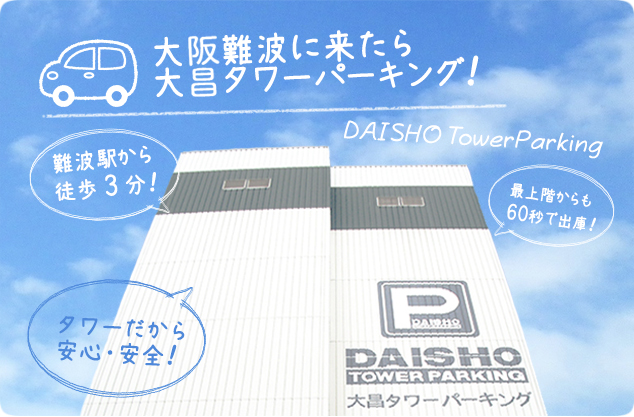 大昌タワーパーキングは大阪 地下鉄なんば駅、日本橋駅から徒歩3分の駐車場です。最寄り駅から近いだけでなく、大阪の様々な観光地へのアクセスにとても便利! もちろん難波でのショッピングにも最適です。大阪市内・難波周辺で駐車場をお探しの方は、ぜひご利用ください!